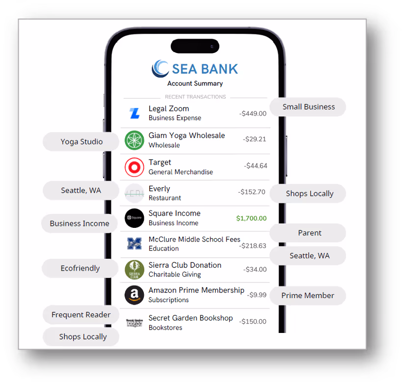 FinGoal enriches transaction data with categorization, tagging and location information that helps to paint a detailed picture of a user's spending. The assigned tags come together to create a comprehensive profile about the user.