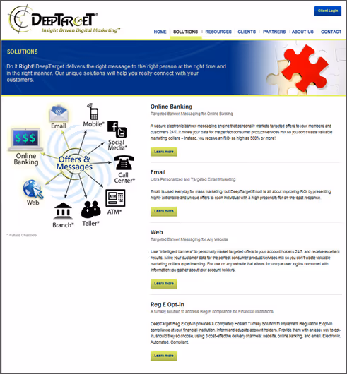 DeepTarget’s flagship product, DeepTarget OLB, takes advantage of precious digital real estate within online banking for cross-selling and communicating with account holders. It is a secure, hosted online advertising solution built on a one-to-one, multi-channel offer management platform. DeepTarget OLB presents highly targeted and personalized offers to members within various online banking platforms.