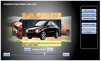 The screen image illustrates the rich user interface which a marketer can utilize to create targeted images. Each image corresponds to a rule. For example, this image of a luxury car could be targeted to everyone who is over 50 years old with household income over $75,000.
