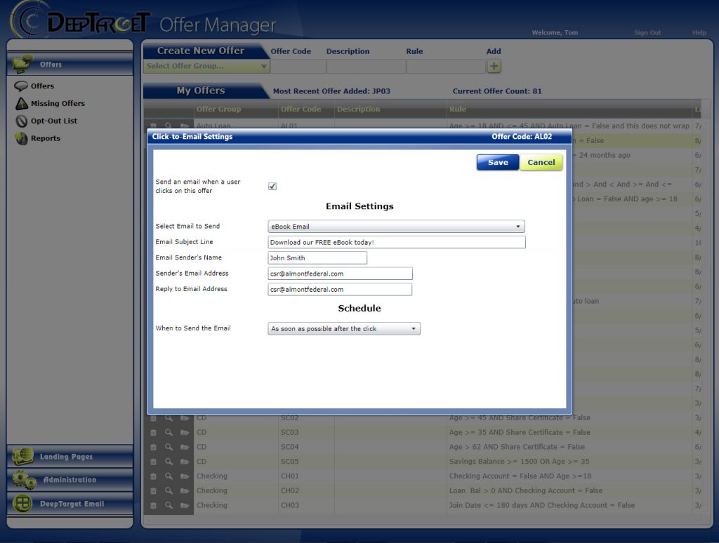 Jeremy Peel, CTO and COO, DeepTarget Inc. said “We continue to add powerful new features to DeepTarget – our focus is all about e-marketing and ensuring that our clients get the most out of using our software. This integration of automated emails as part of the online banking marketing platform further strengthens multi-channel integration. We are confident that DeepTarget continues to have the technology edge in the industry for multi-channel e-marketing for financial institutions.”
