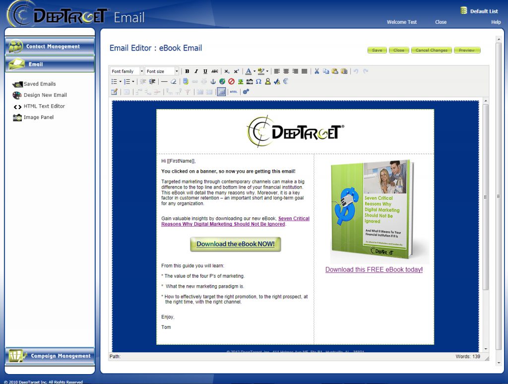 In addition, the marketing departments of banks and credit unions can utilize the powerful yet easy-to-use email editor to create their own branded, personalized and customized email (figure 2). When an account holder clicks on a banner to find out more information about a product, for instance, DeepTarget will send the pre-configured email to that customer for follow-on action. This further strengthens the lead generation capability of the financial institution.